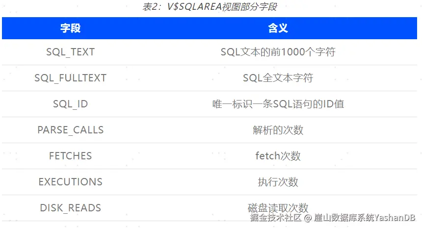 通过查询这些视图中执行时间列,并按其降序输出就能获取相关慢SQL。其中视图相关字段如表2所示: