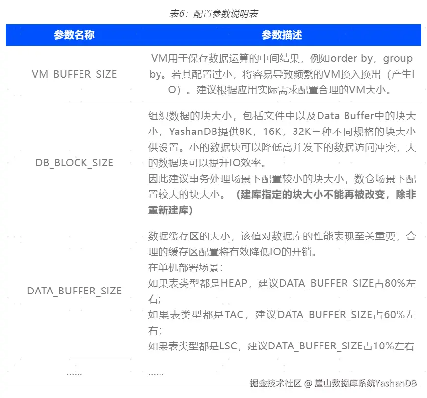 从上述章节可以得到SQL语句性能的好坏跟数据库内存息息相关,不同的内存配置在特定场景下对性能有着极大的影响。本章节介绍YashanDB数据库中部分配置参数如表6所示,并指导如何配置才能获得较好的性能效果。