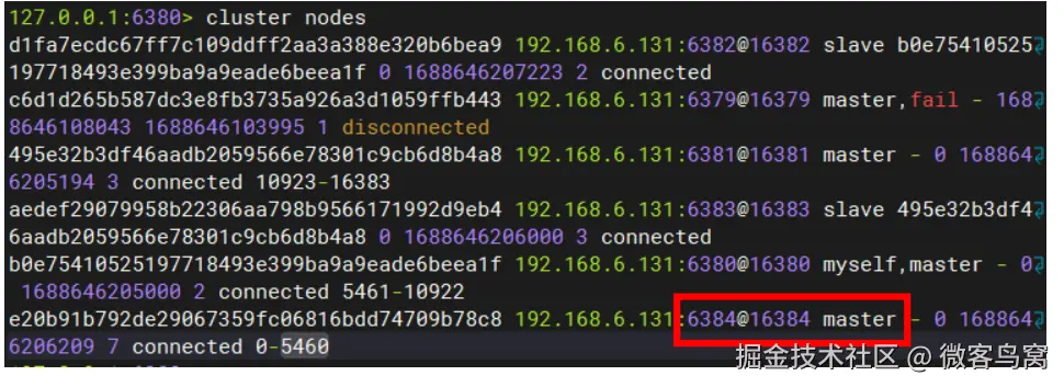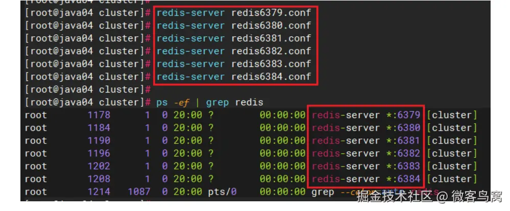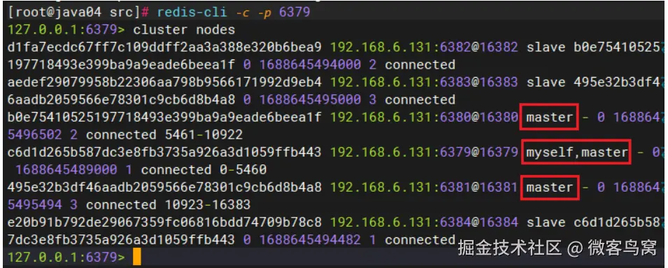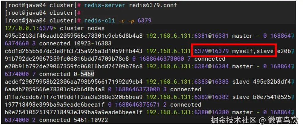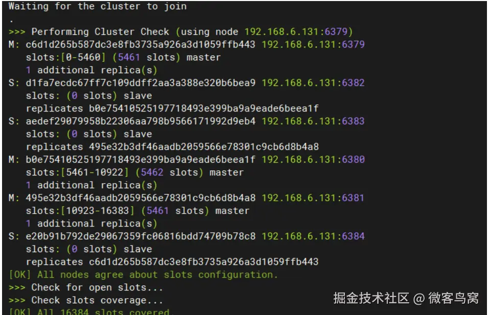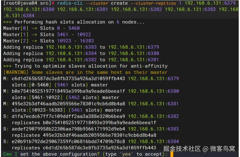 redis-cli --cluster create --cluster-replicas 1 192.168.6.131:6379 192.168.6.131:6380 192.168.6.131:6381 192.168.6.131:6382 192.168.6.131:6383 192.168.6.131:6384