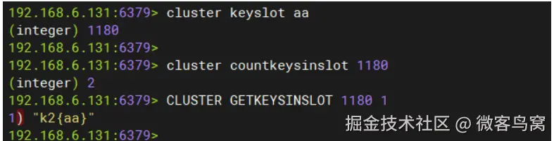 - CLUSTER GETKEYSINSLOT <slot><count> 返回 count 个 slot 槽中的键。