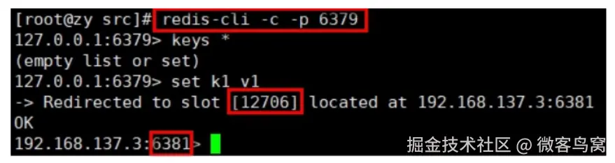 - 在redis-cli每次录入、查询键值,redis都会计算出该key应该送往的插槽,如果不是该客户端对应服务器的插槽,redis会报错,并告知应前往的redis实例地址和端口。