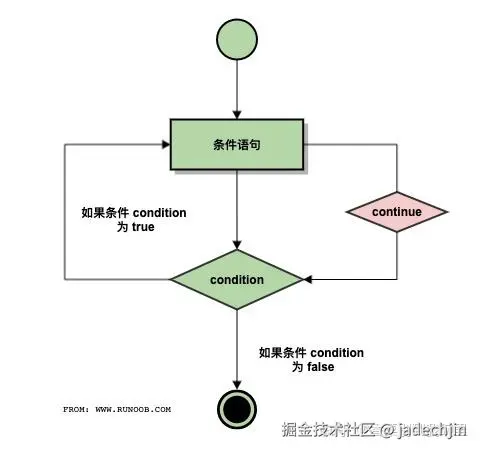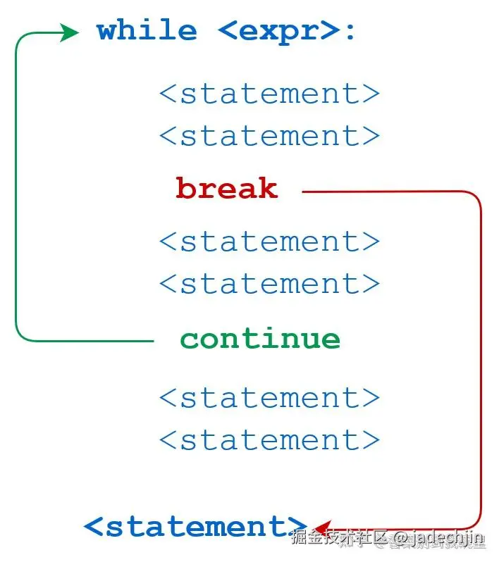 以下这张图能直观的看出在while循环中break与continue的区别: