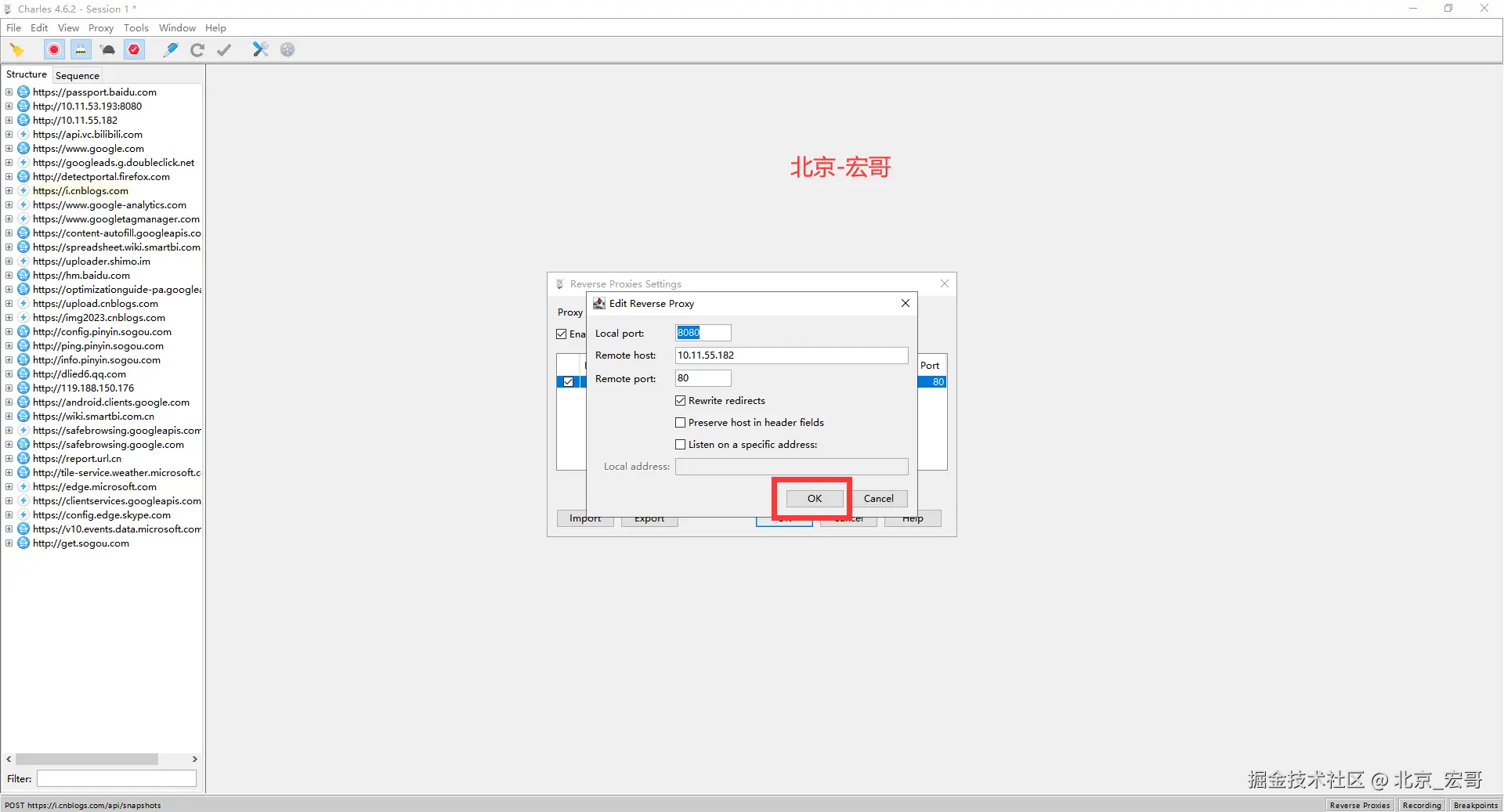8.在charles中会监测到反向代理访问,首次会弹出是否允许访问,选择'Allow'按钮,允许访问。没有设置代理之前是访问不到的,如下图所示: