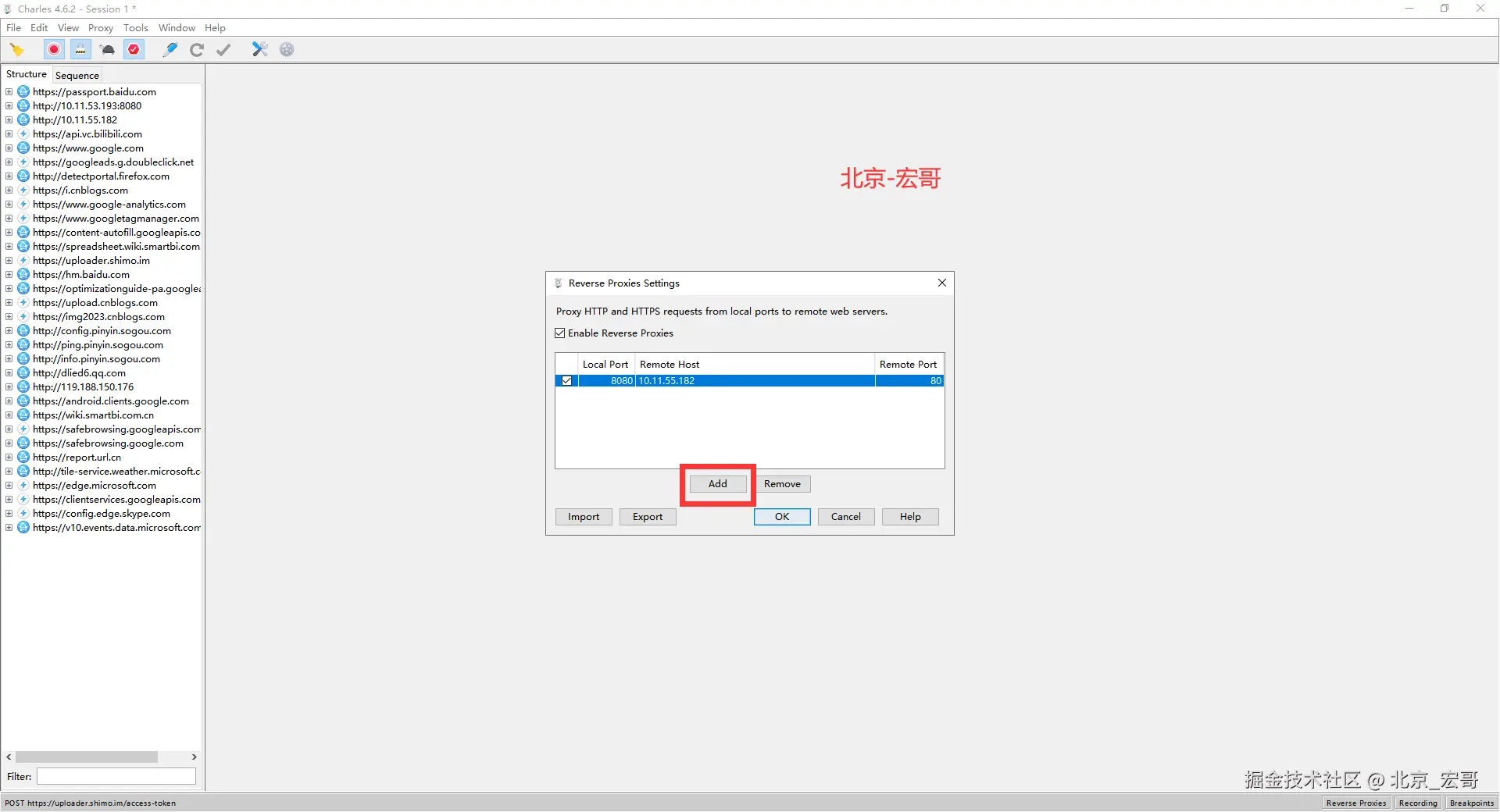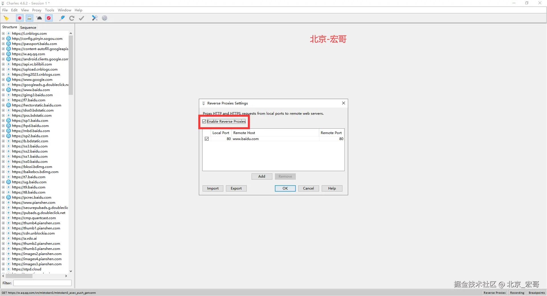 3.选中charles上的"Proxy"-》"Reverse Proxies",进入反向代理设置界面,如下图所示:
