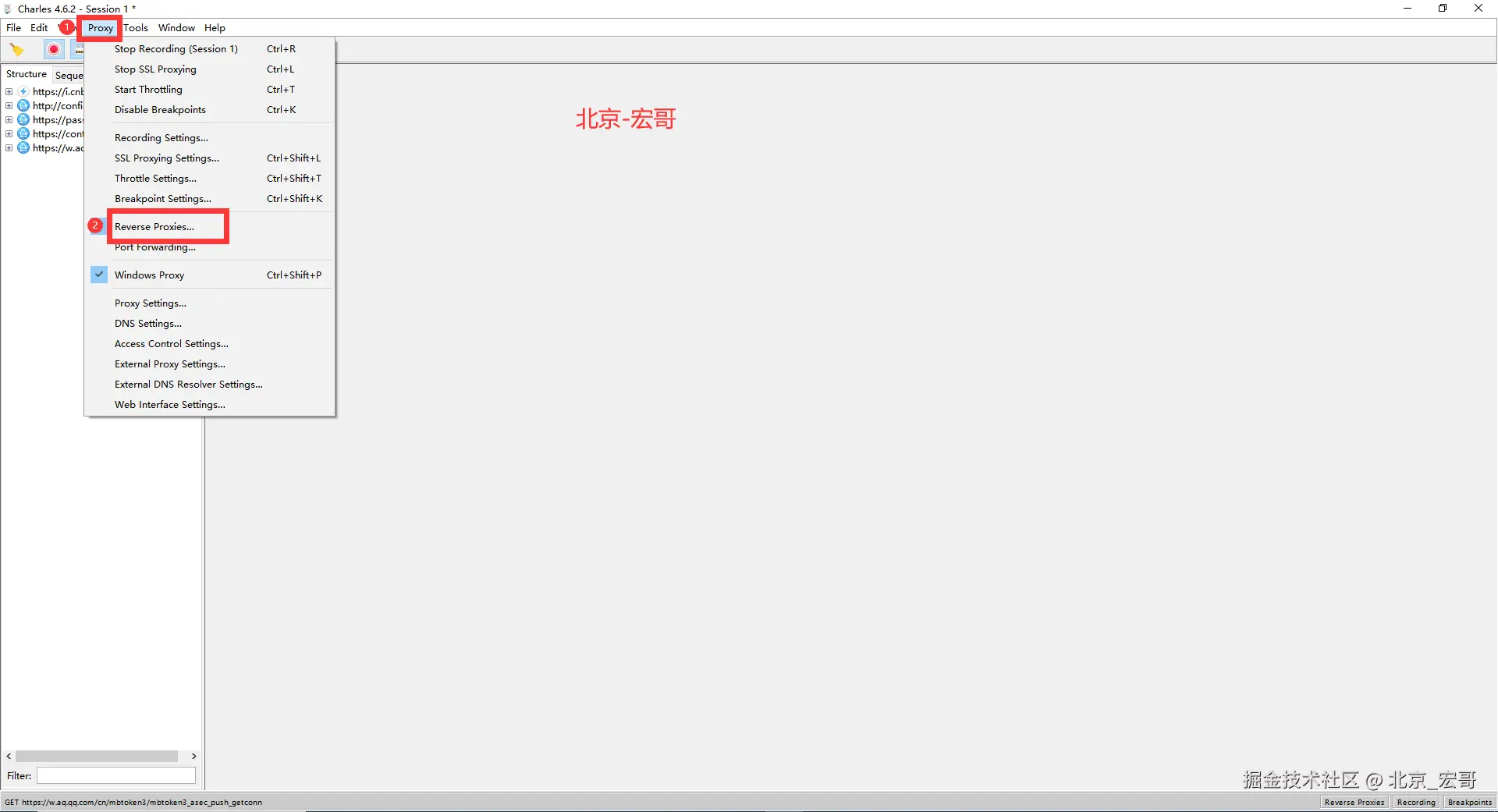 2.打开Charles,勾选Proxy --> Reverse proxise...,进入反向代理设置界面。如下图所示: