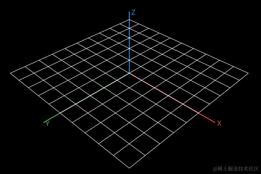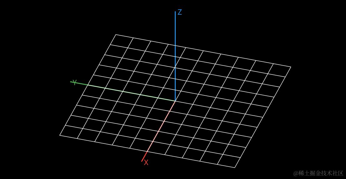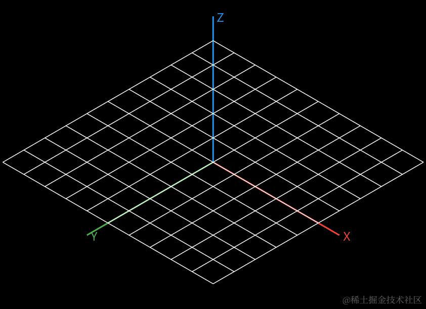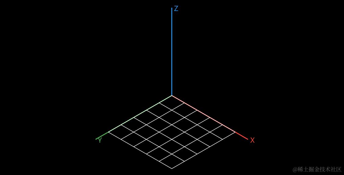 在数学的立体几何中,一些辅助线可以更好地帮我们理解三维空间。 这里准备在 X-Y 平面绘制一个网格,体现出地平线,这可以在视觉上让我们更具有归属感: