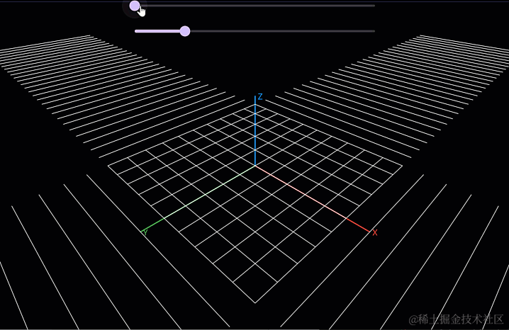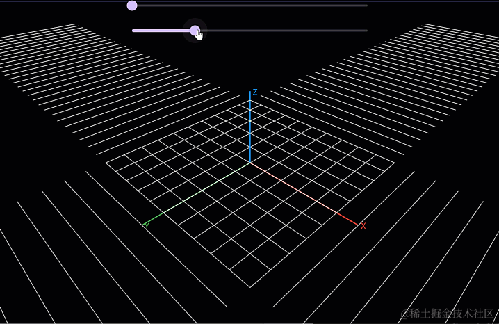 仔细观察不难看出,目前的地平面每条线都是平行的,这对于近大远小的视觉感来说比较为何,特别是旋转角度后,这种绝对的平行会产生违和感: