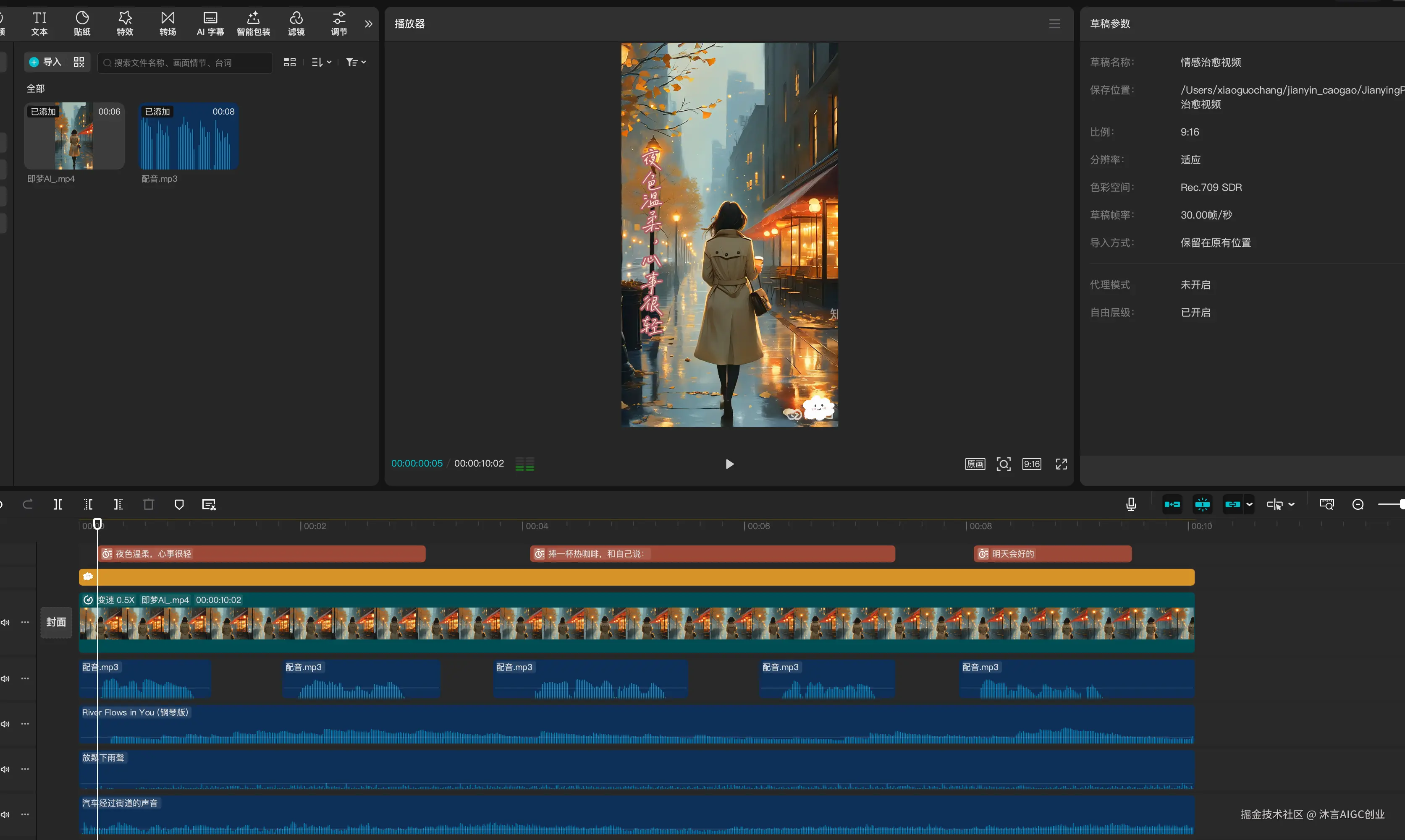 将前面生成的视频、配音导入剪映,然后添加一些背景音乐和音效: