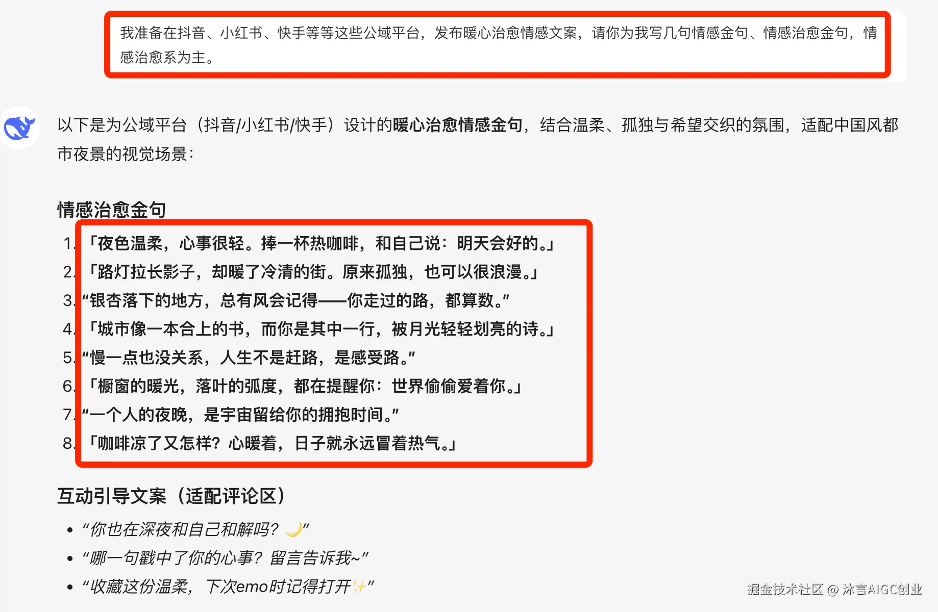 我们使用DeepSeek生成暖心治愈情感文案,提示词如下: