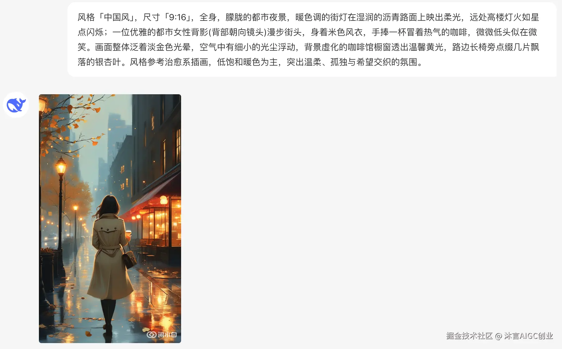 我们可以使用如下提示词,通过DeepSeek生成一张图片(当然用即梦、豆包也可以),下面这种提示词,描述一个场景后可以让AI帮你生成。