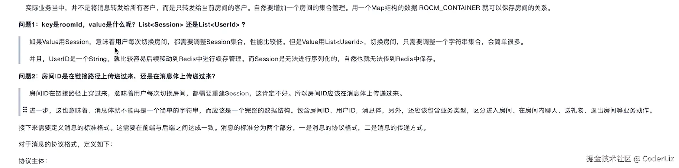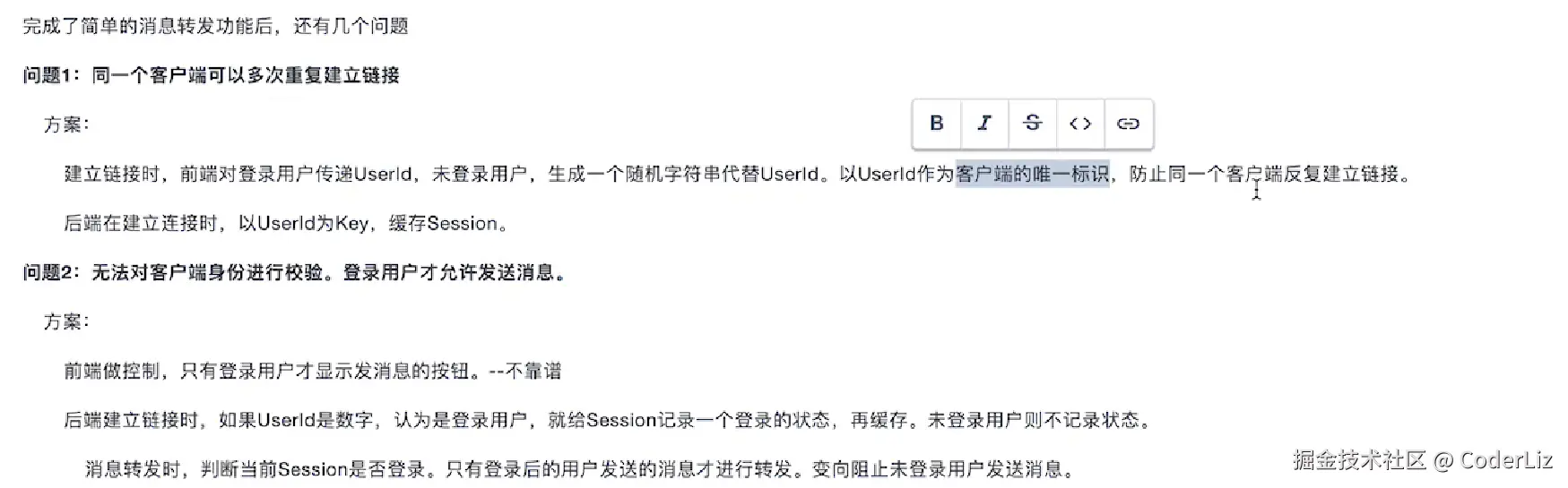 因为这个接口是开放的,所以加了一层token鉴权,服务除了返回服务地址外,还会返回一个随机Token存入redis中,Val为用户ID,在前端与IM系统建立连接的时带上token,IM系统去redis中验证Token是否合法,不合法就拒绝请求