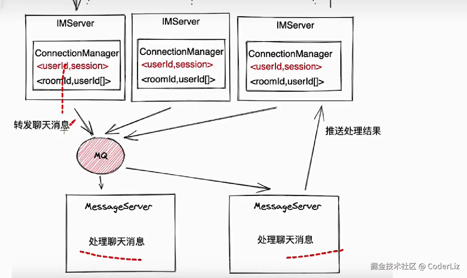 虽然IMServer实现了请求接入时的负载均衡功能,但是每一个IMServer的ConnectionManager(链接管理器)中保存的Session缓存和房间与用户数据信息还只是保存在每一个应用的内存中,因此如果多个前端的长连接建立在不同的IMServer上,那么就算它们进入了同一个直播间,也是无法实现跨进程的消息推送的。因此还要实现多个IMServer服务实例的集群化设计