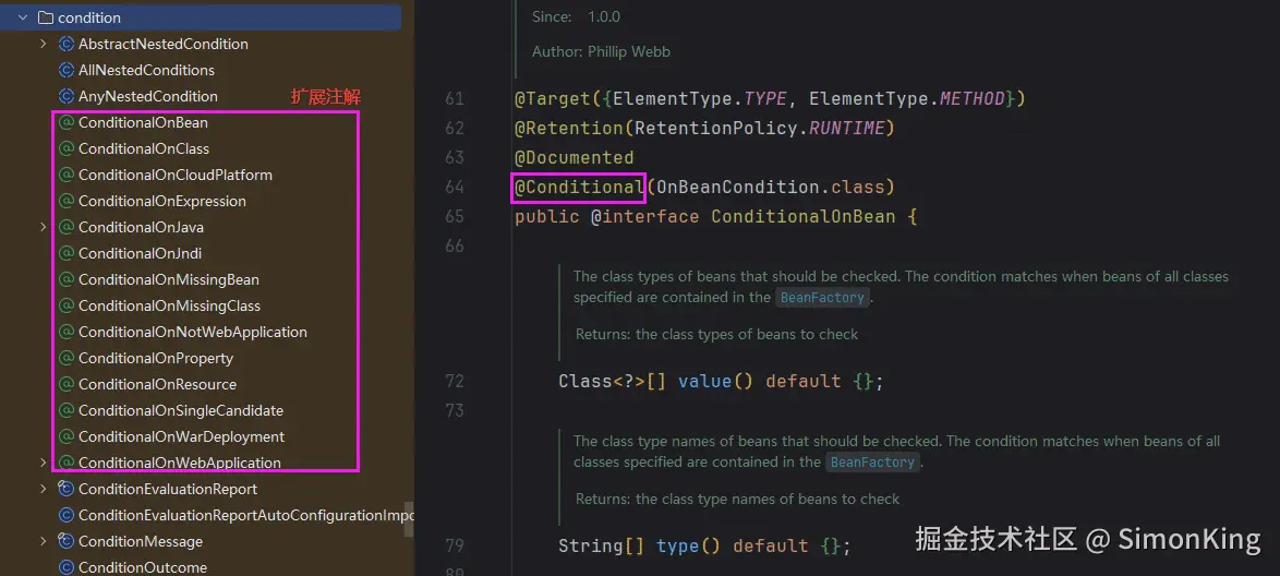 其实我们在平时使用的时候,往往不会直接去用@Conditional注解,反而经常会使用其扩展的注解,如下: