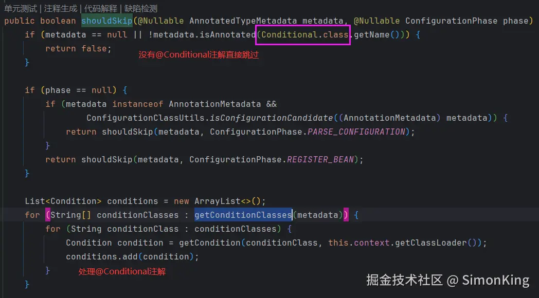 可以看到,在shouldSkip()方法中,首先会判断类或方法上是否标注了@Conditional注解,如果没有标注@Conditional注解,则直接返回false。