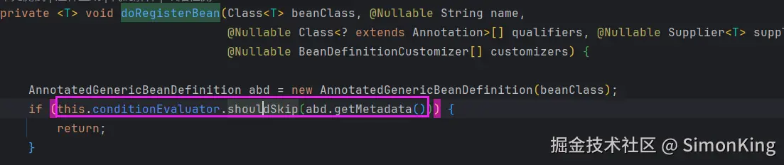 此时,调用的doRegisterBean()方法根据shouldSkip()的返回,决定要不要把对应的Bean会被创建并注入到IOC容器中。