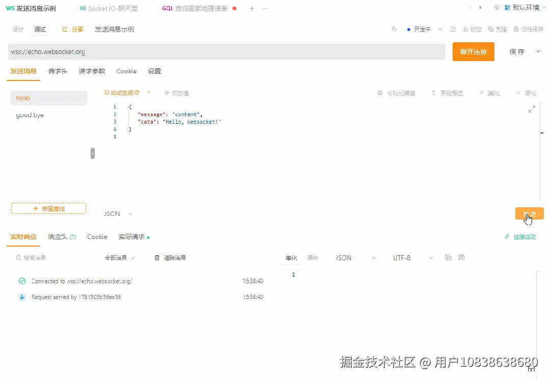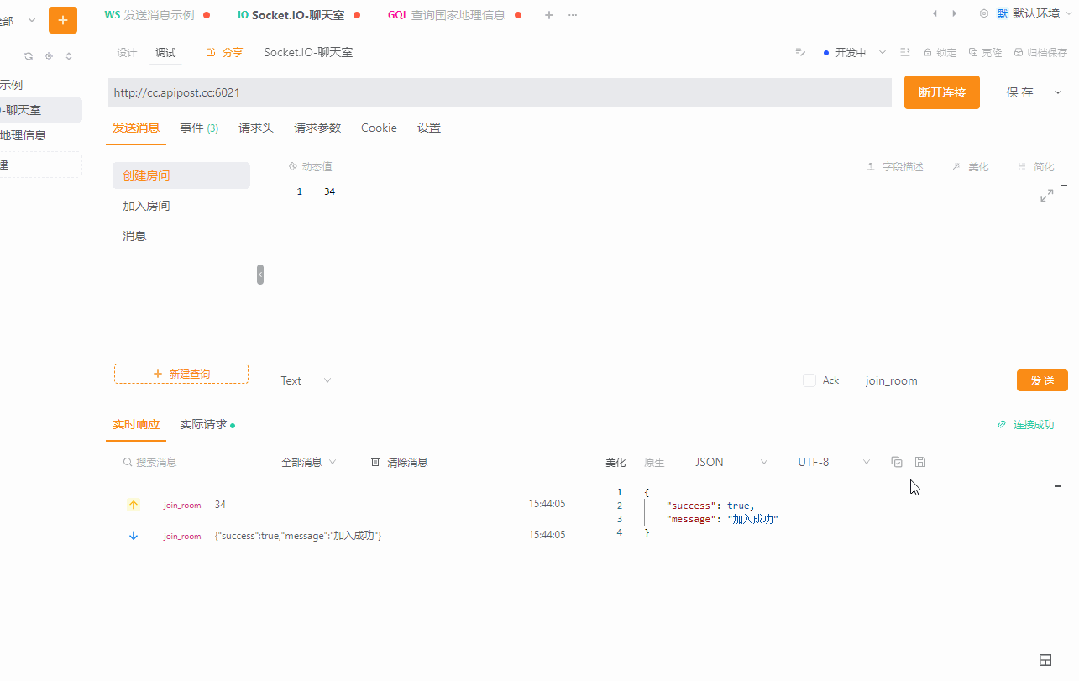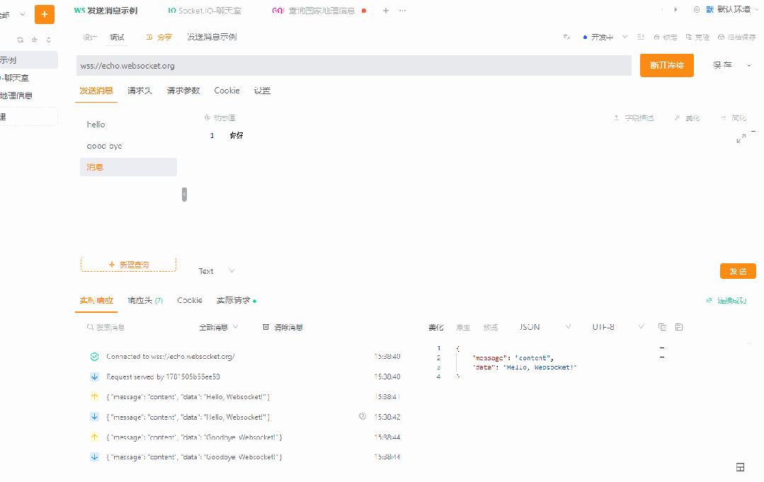 在Apipost中,Websocket与Socket.IO被拆分,我们需单独创建两种类型的接口进行调试。同时,这两种类型都支持维护多个消息示例。
