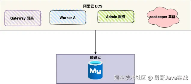 勇哥将服务部署到 1 台阿里云服务器上,数据库部署在腾讯云。
