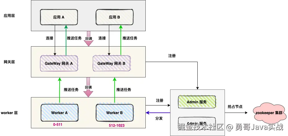 1、网关层负责应用的接入,任务的推送。
