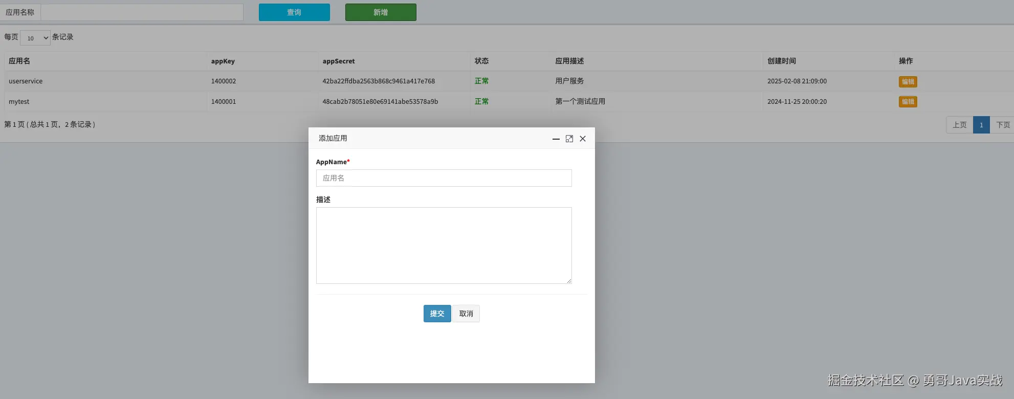 我们生产环境创建了1个应用,应用名是: mytest , appKey 为 1400001,客户端访问任务调度系统需要配置 appKey 和 appSecret 。