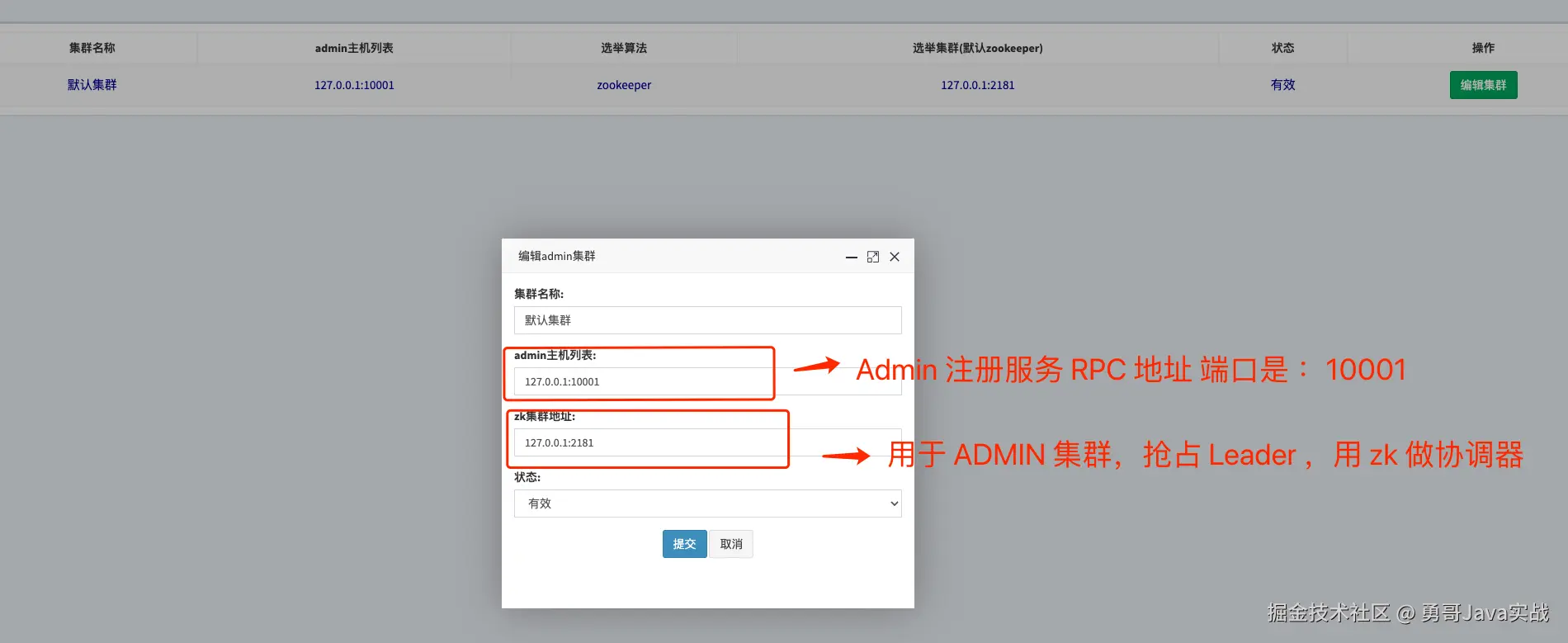 - zk 集群地址 ,用于 Admin 集群,实现主从模式 。
