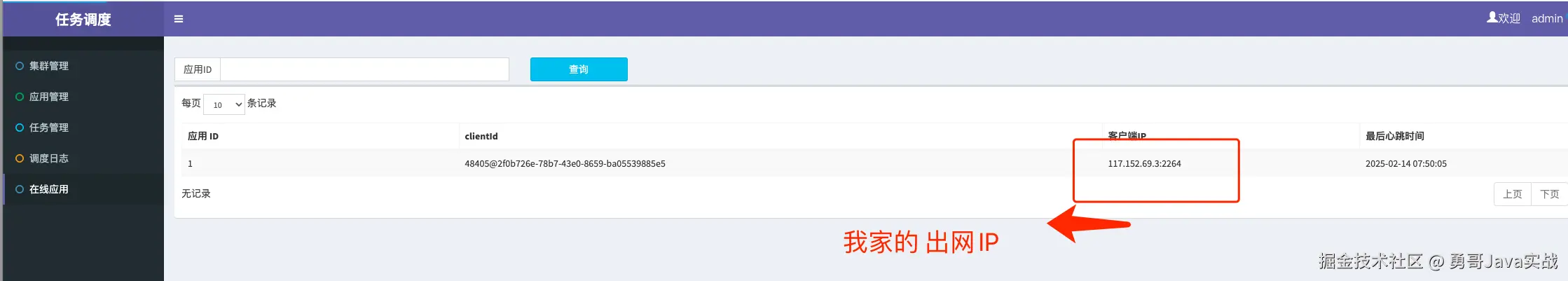 对于客户端来讲,任务执行是网关推送过来的,所以我们在家运行代码也可以执行。网关会保存客户端的出网 IP ,在线应用列表可以展示所有在线客户端。