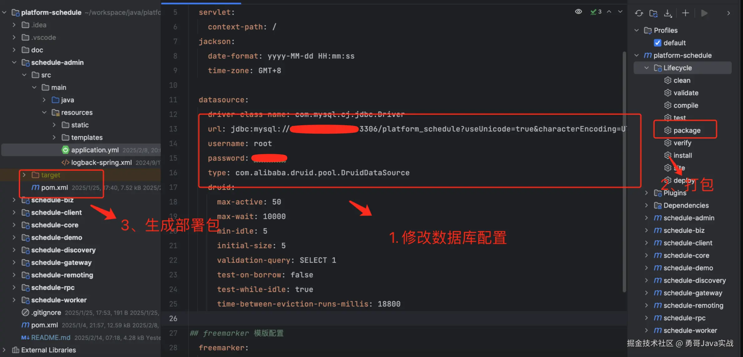 在 Admin 模块、GateWay 模块、Worker 模块执行三个步骤:修改数据库配置、打包、拷贝部署包到服务器。