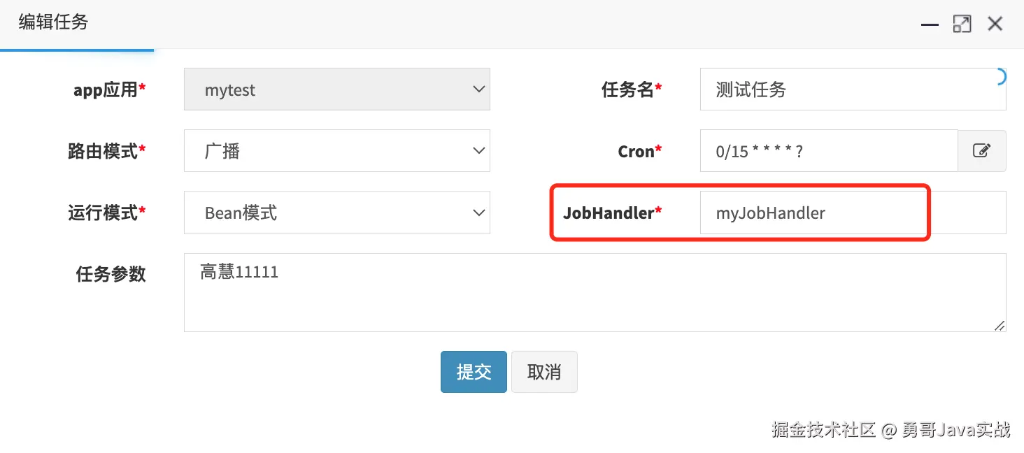我们定义了一个任务 ,名称是:测试任务,每 15 秒执行一次,jobHandler 定义为 myJobHandler 。