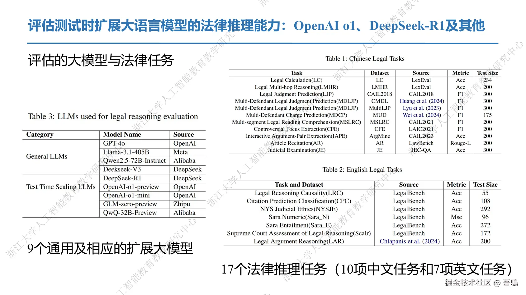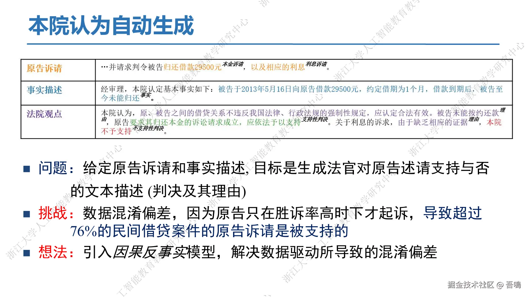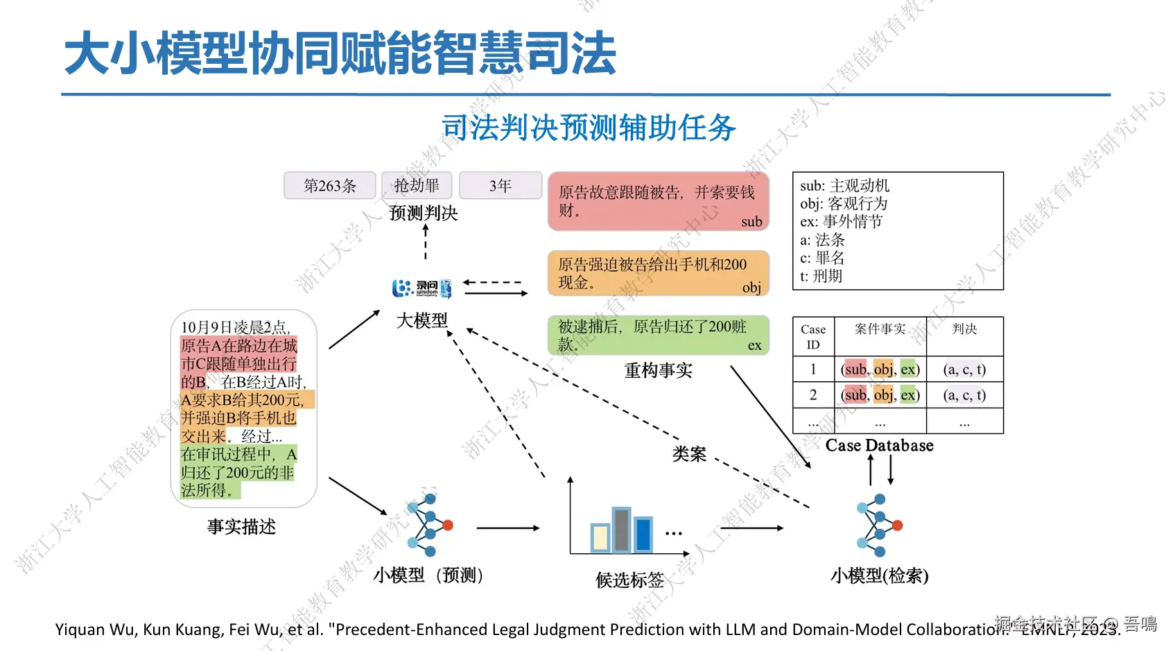 - 法律知识增强:通过因果反事实模型解决数据偏差,结合法律知识图谱与一阶逻辑编码,提升判决可解释性。
