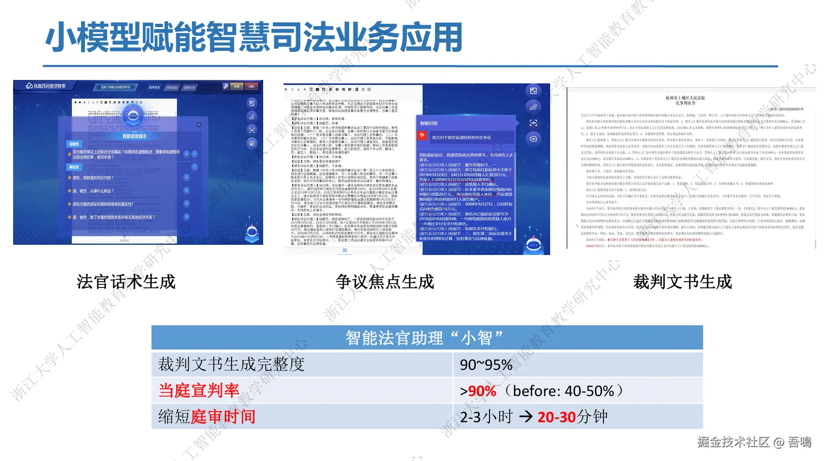 - 智能审判辅助系统:自动生成争议焦点、证据链分析、判决文书,缩短庭审时间,提升当庭宣判率。