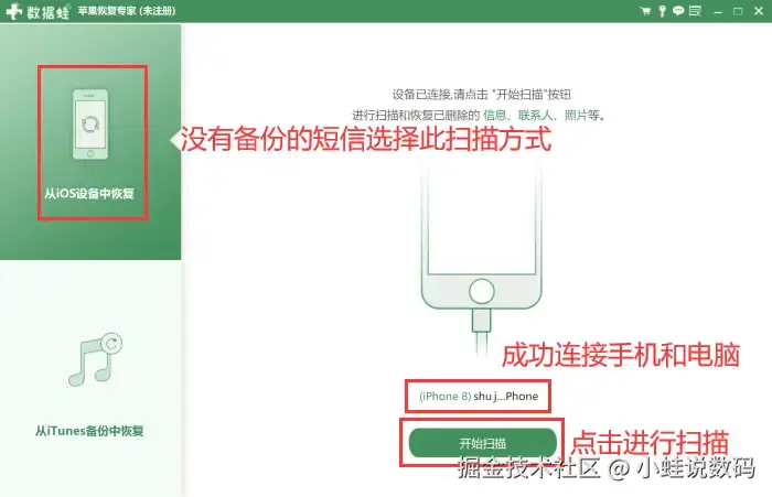 数据蛙苹果恢复专家的主要优点在于支持恢复包括短信在内的多种数据类型。且采用先进的扫描技术,快速定位并高效恢复已删除但没有被覆盖的数据。同时软件的界面友好,操作简便,无需专业知识。下面就是具体的操作方法:
