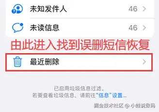 如何找回删除的短信?苹果手机从iOS16版本及iPhone14系列开始,为短信新增了【最近删除】的选项,允许用户在30到40天内恢复最近删除的消息和对话。恢复步骤如下: