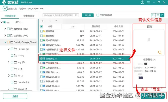 步骤2: 扫描结束后我们可以选择自己需要恢复的文件,可以在右方查看文件的信息进一步确认目标文件,确定后点击“导出”;