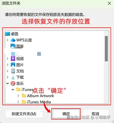 步骤3: 在“浏览文件夹”中选出恢复文件的存放位置,点击“确定”。