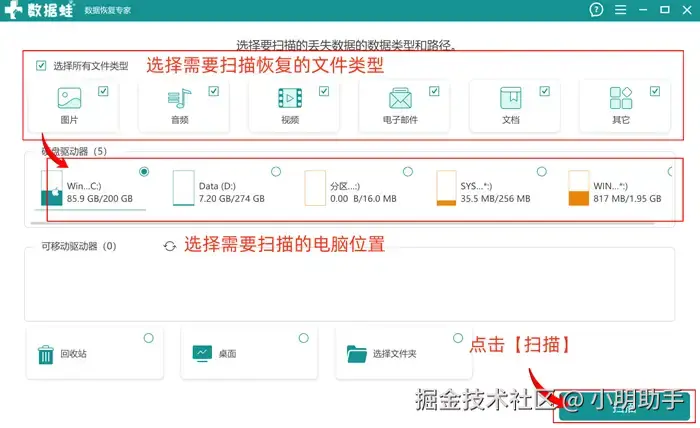 步骤1:在电脑打开软件,在软件的首页上选择自己需要恢复的文件类型,进而在下方选择需要进行扫描的电脑位置,点击【扫描】;