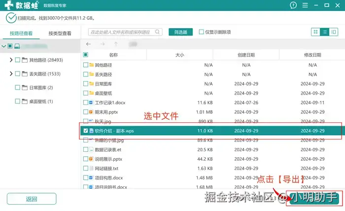 步骤2:在软件显示【扫描完成】后,用户可以在软件页面的中间选择需要进行恢复的文件,选中后再点击【导出】;
