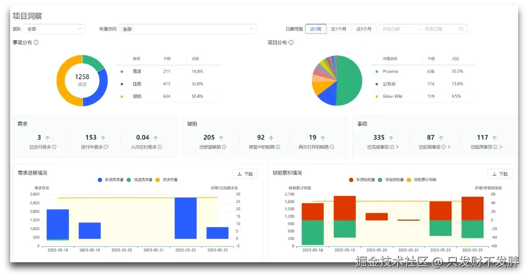 Jira 仅提供简单报表,而 Gitee Team 提供企业级效能度量,涵盖 组织/项目/需求/研发/运维等全维度,超过 100 个指标开箱即用,让企业能够精准衡量研发效能,持续优化流程。