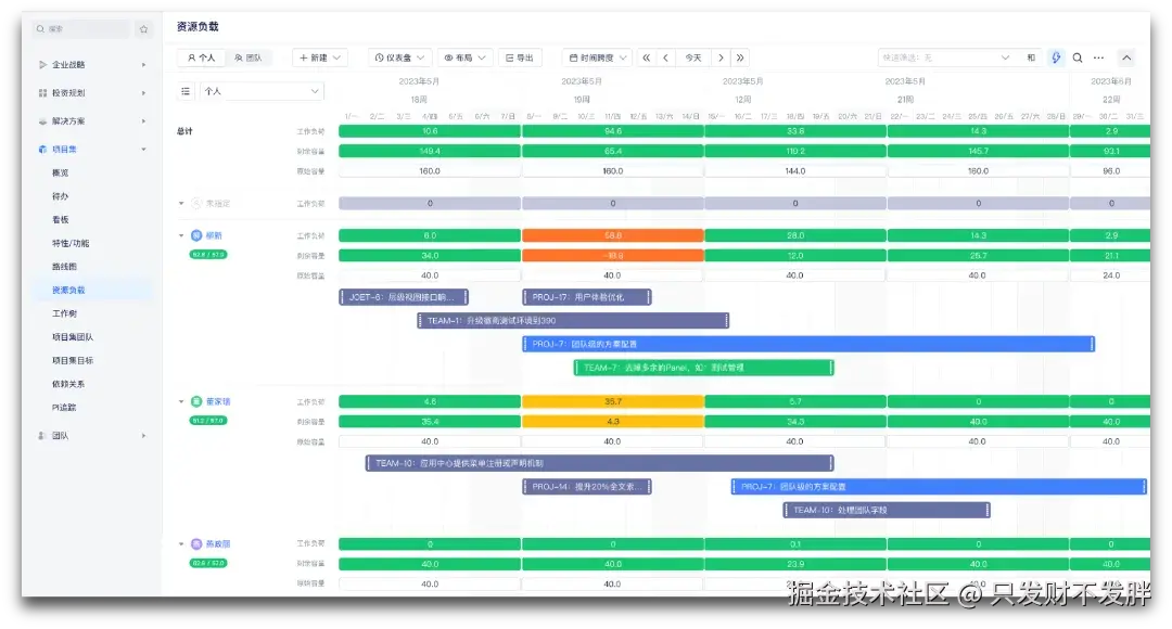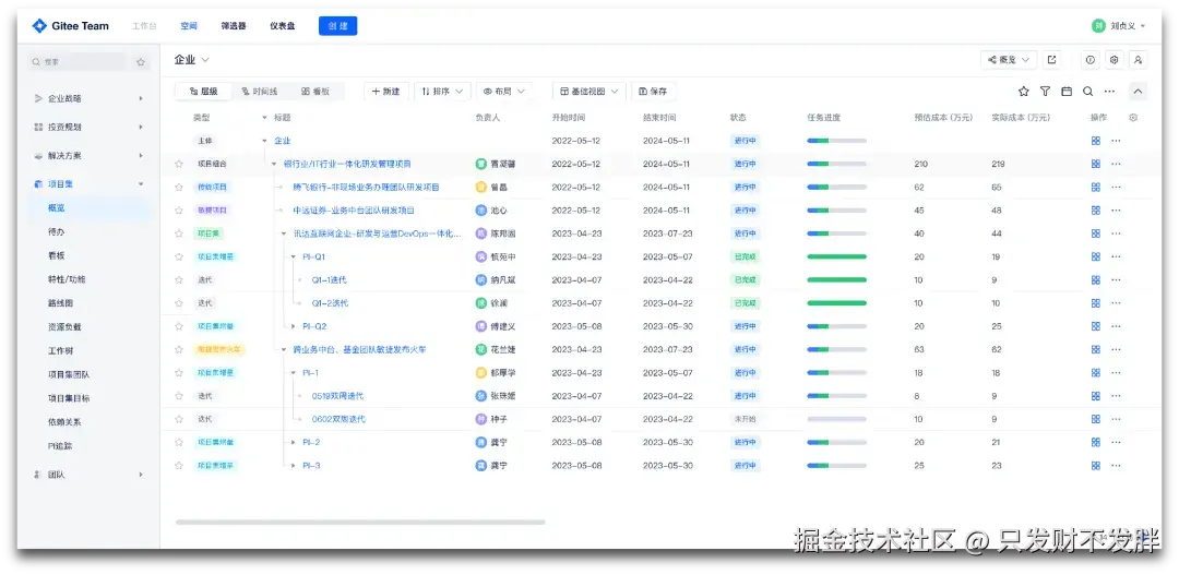 Jira 依赖插件(如 JIRA Align / BigPicture)实现跨项目管理,而 Gitee Team 内置企业级双态项目组合管理,支持 SAFe 6.0 精益组合管理,不仅满足敏捷开发需求,也能兼顾传统项目的管控。