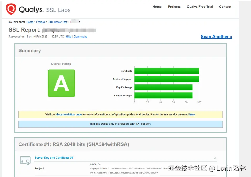 - 为了进一步验证猜想,我使用 SSL Labs Server Test 对服务器的 SSL 证书进行检测,结果显示: