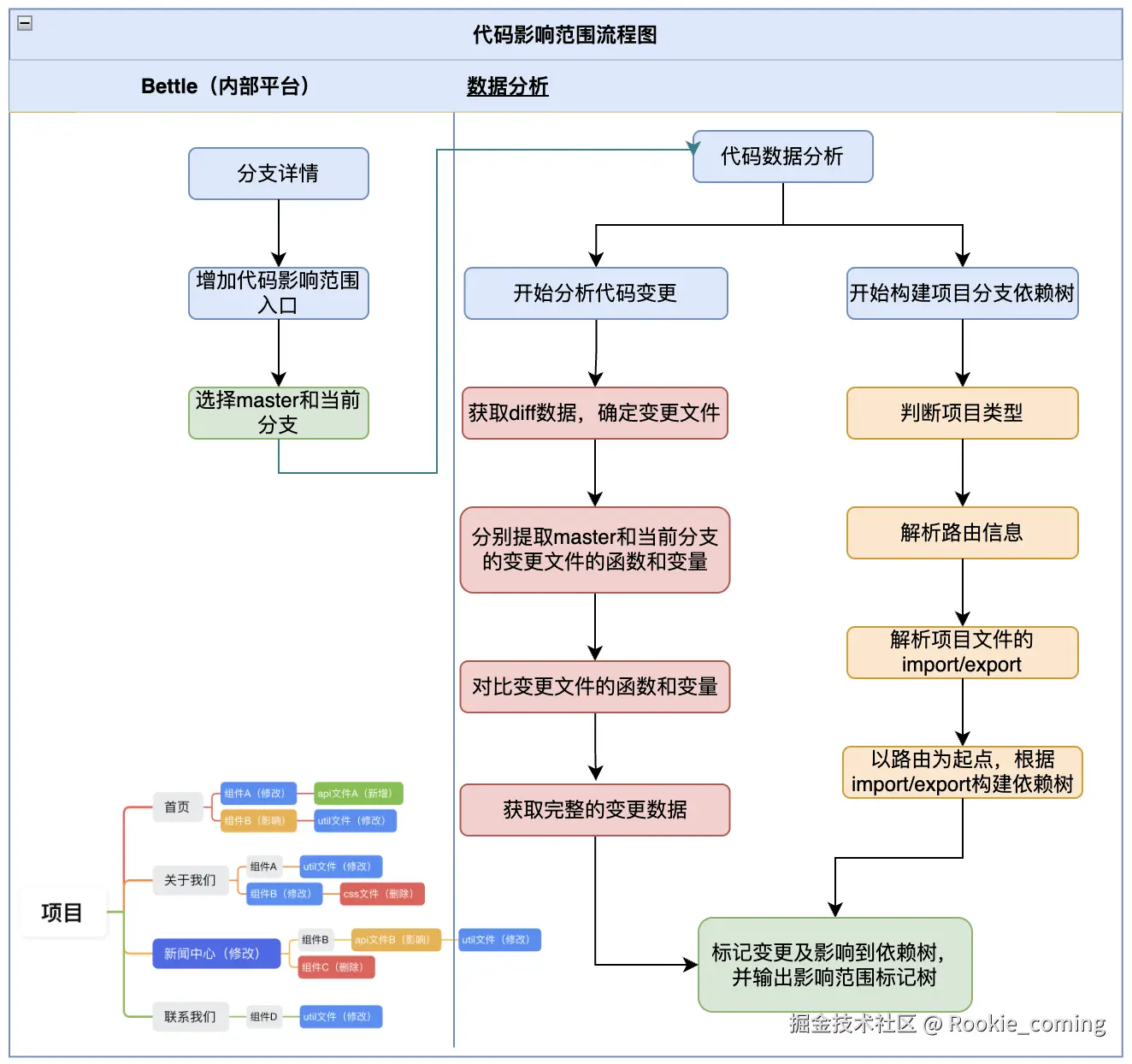 代码影响范围架构设计分为多个关键步骤。通过以下的架构流程,可以系统化了解该项目是如何分析和标记代码变更的影响范围。