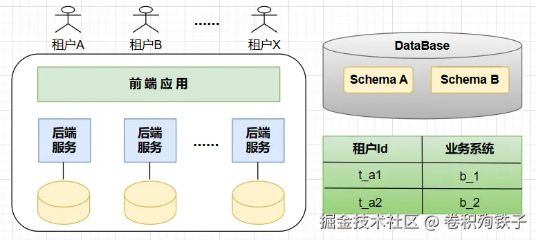 - SaaS平台与租户的关系: 这个平台里面有多个租户,一般的话采用共享数据库独立数据架构的模式,容纳几十个租户应该问题不大。