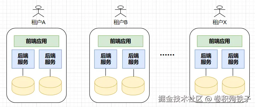 - 成本问题: 每个租户都需要单独的部署环境,那么花费在每个租户上的成本就会非常高,会大幅度降低 SaaS 软件服务的盈利能力;