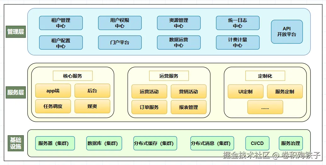 这一层就是具体提供的系统服务了,这些服务是由开发者开发的,一般情况下所有租户都是共享一套代码和系统的,特殊定制化的服务除外。