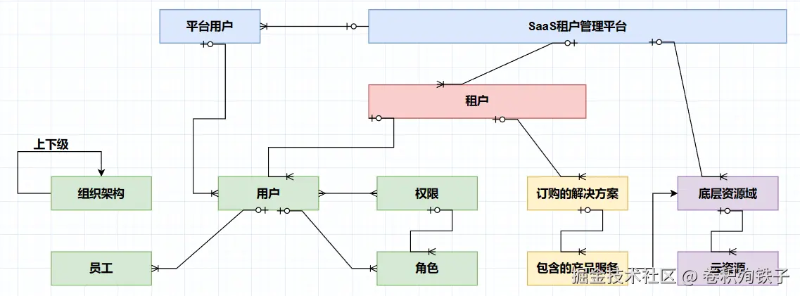 - 租户与组织用户的关系: 租户一般指的是企业或者组织,通常会有一些员工担任管理员的角色来管理购买的 SaaS 服务。