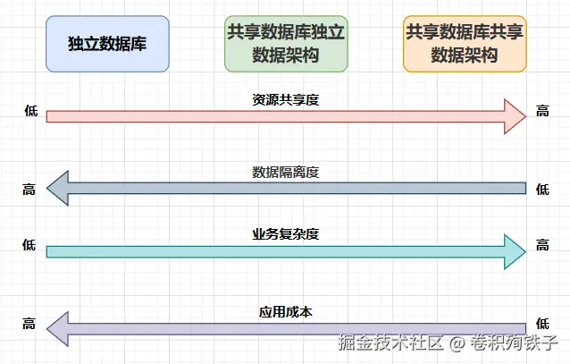 - 数据隔离度: 当租户对于业务数据的隔离要求比较高时可以选择竖井,成本比较紧张或者在初始阶段可以考虑共享数据库;