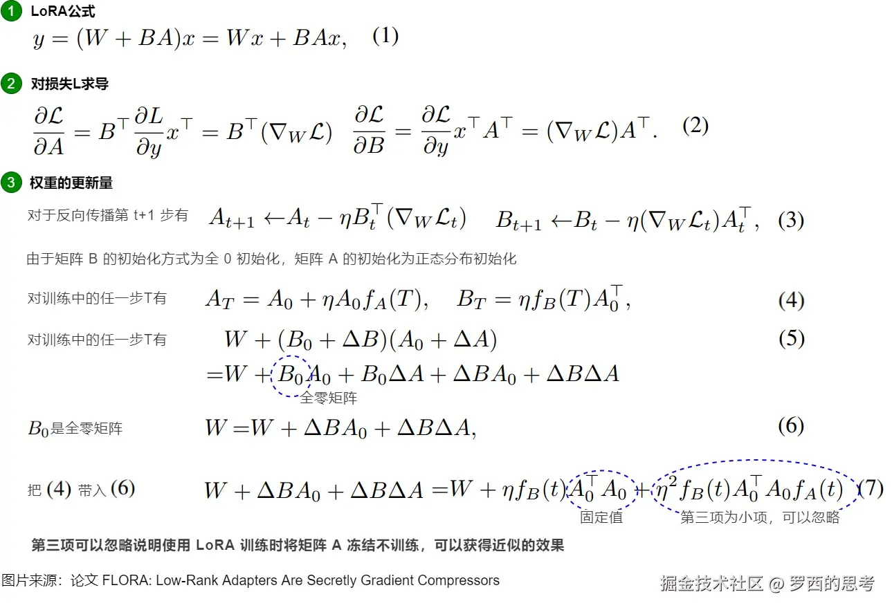 - 冻结B会投影掉大部分输出,而冻结A只会投影掉部分输入特征空间,这通常影响较小。