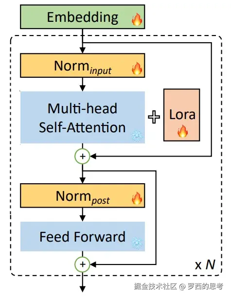 - 假设模型矩阵为,由参数来初始化。训练时,原始的预训练权重保持冻结,在训练期间不接收梯度更新(即 是固定不变的),只计算需要更新的参数权重的变化。
