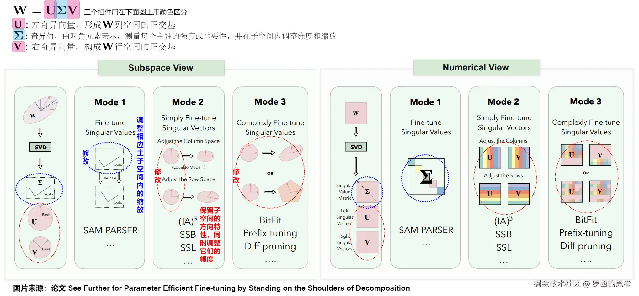 在SVD分解中,给定大小为 𝑚×𝑛 的实数矩阵 A,对 A 进行 SVD 后得到的输出为 。即,原始权重矩阵被分解为三个主要组件,它们共同涵盖了原始矩阵空间的全部。