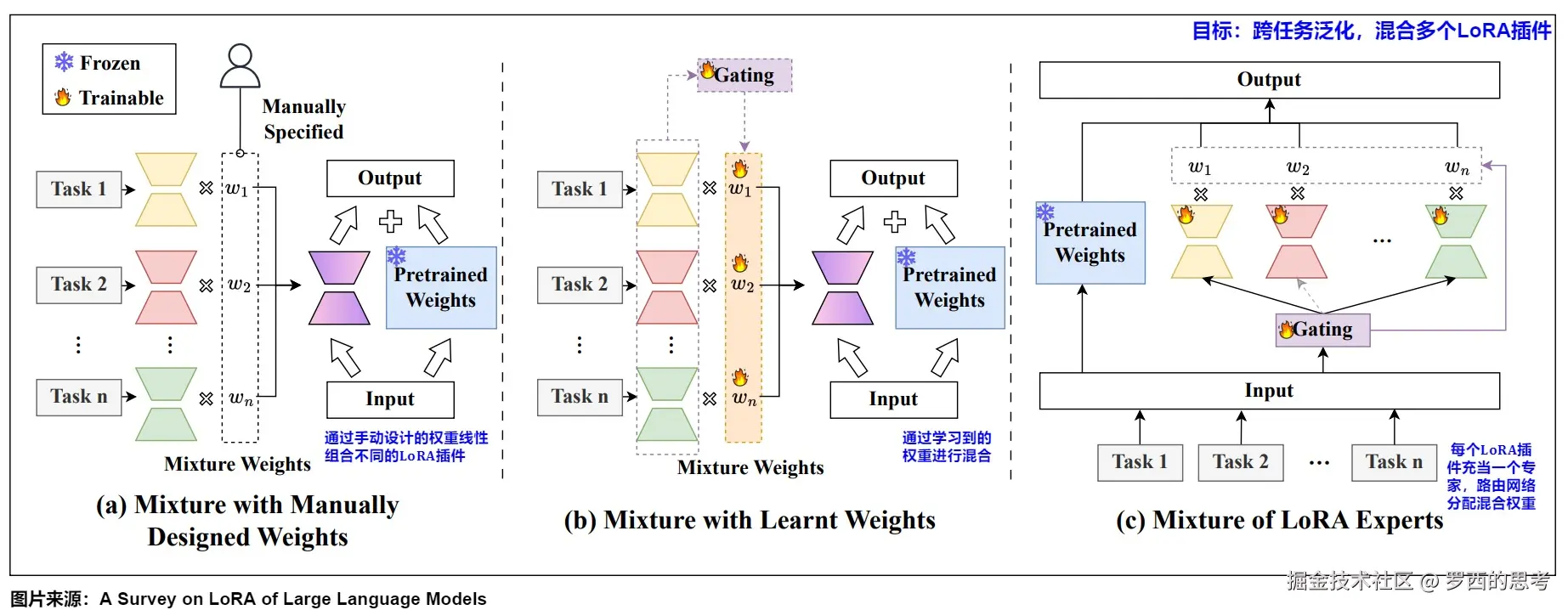 这种将多个LoRA插件混合在一起,叫做LoRA混合,其有多种方案。现有的LoRA混合方法可分为(1)手动设计权重的混合;(2)学习权重的混合;(3)LoRA专家混合。