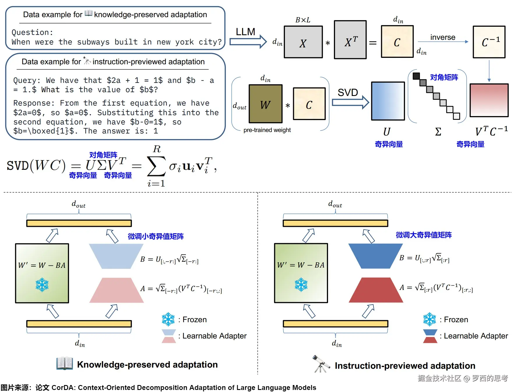 - 接着,对权重与协方差矩阵的乘积执行奇异值分解(SVD)来构建面向下游任务或世界知识上下文的可学习适配器。具体来说,使用输入激活的协方差矩阵与预训练LLM的每个线性层的权重相乘,然后进行SVD分解。