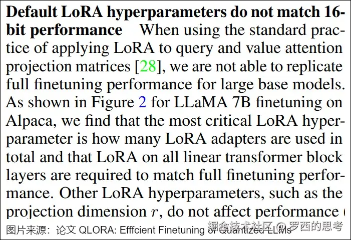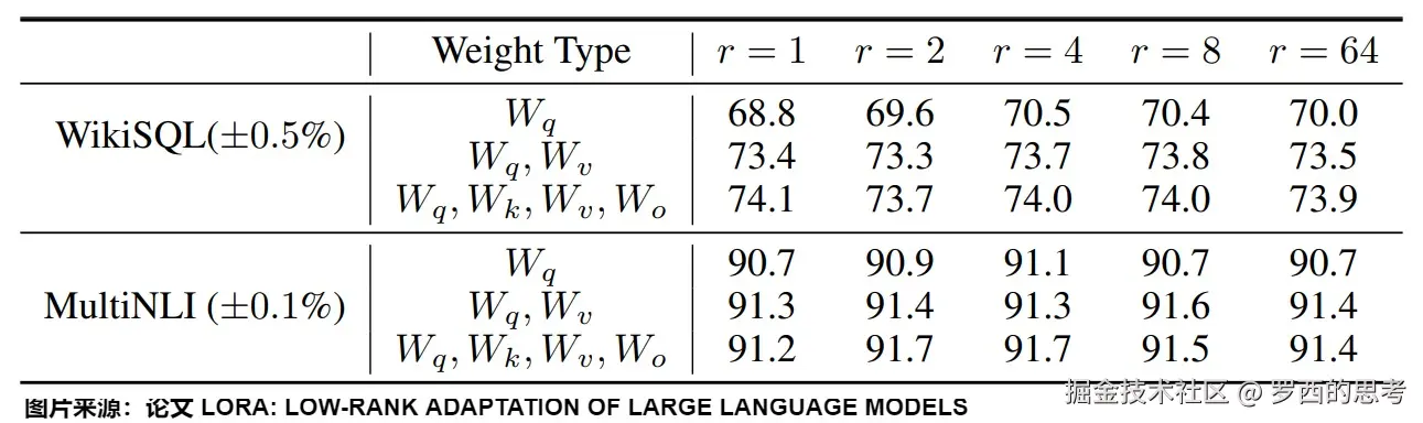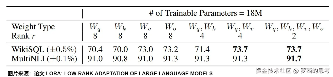 - 将所有参数微调放在 或 (或者说,放在注意力机制中的某个矩阵)中会导致性能显著降低,但同时对 和 进行调整会得到最佳结果。